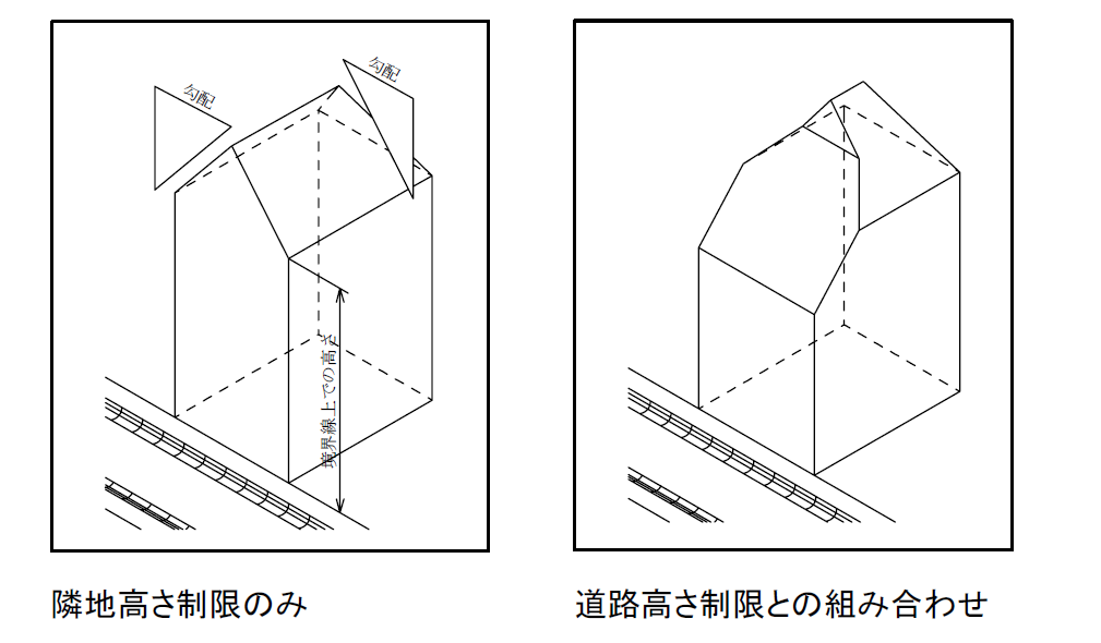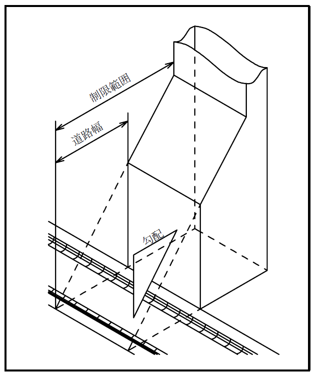 前面道路の反対側の境界線から指定された勾配で斜面を作ります。その斜面と敷地で囲まれた領域が建築可能範囲です。制限を受ける範囲は容積率によって決まります。