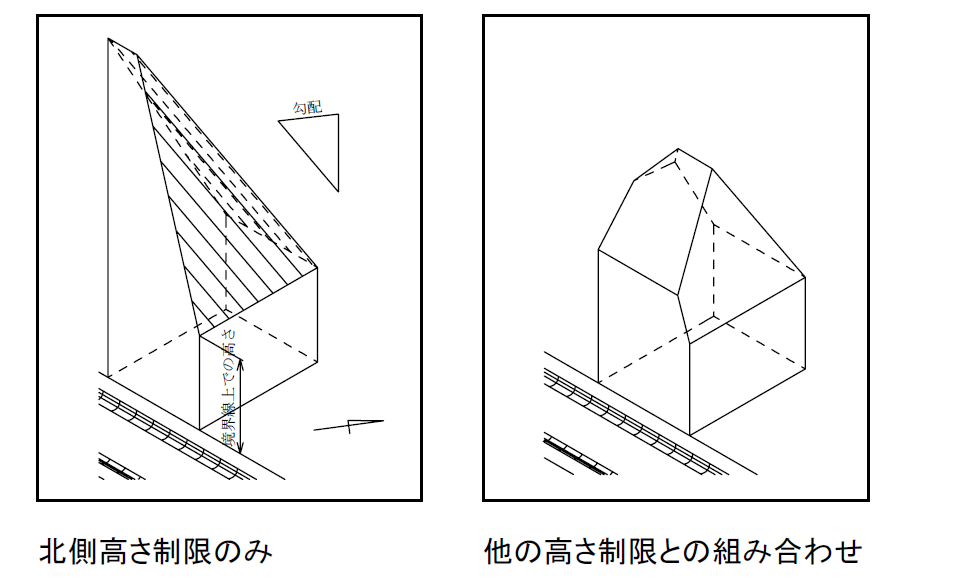 ただし、斜面の方向は南北軸の方向です(他の高さ制限は境界線に直角)。その斜面と敷地で囲まれた領域が建築可能範囲です。