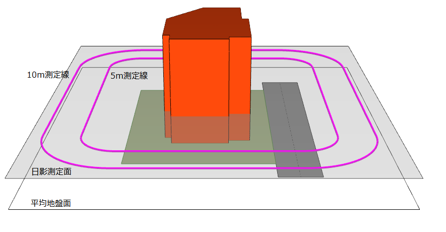 計画建築物がある敷地の境界線からの水平距離が、5m、10mとなる点を結んだ連続線のことを測定線と呼びます。日影規制時間が設定されている領域の境界を示します(異なる日影規制の地域が隣接している場合、その境界線も測定線として扱われます)。